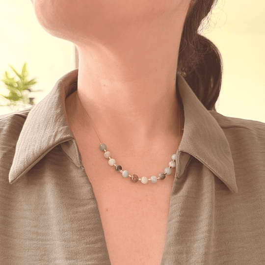| Collar Caroco corto, con piedras naturales en mix de tonos tierra: Agatas y Amazonitas naturales pequeñas intercaladas con mostacillas doradas, todo sobre un hilo de acero dorado flexible y resistente. El collar mide 43cm. de largo total abierto. Material: bronce bañado en oro de 18k. Recomendaciones de cuidado: Mantén tus joyas separadas unas de otras para evitar que se enreden y se rayen. Evita el uso de forma de directa de químicos como perfumes, cremas y productos de limpieza. Guarda tus accesorios limpios en un lugar seco y lejos del sol y la humedad. |